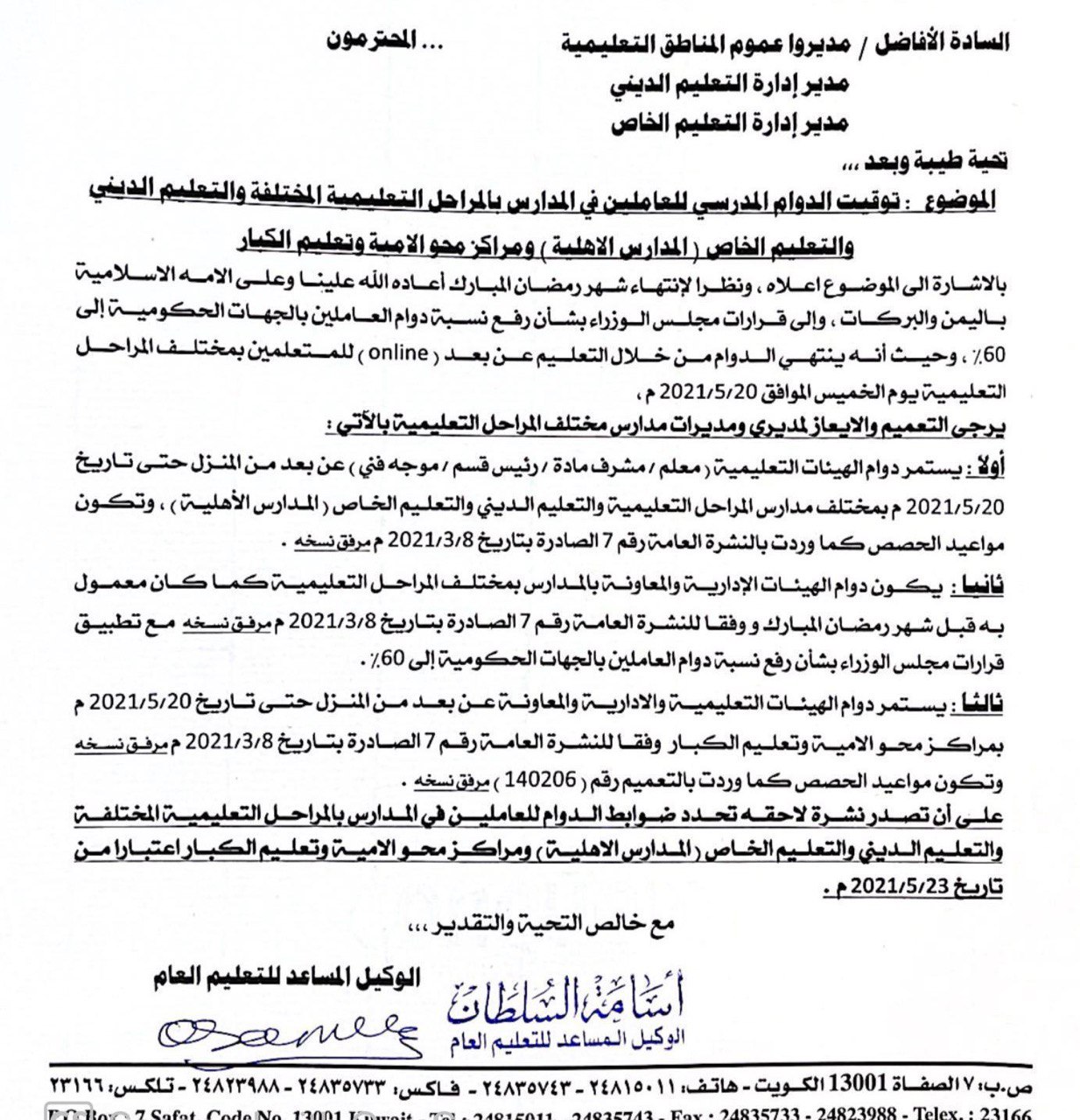 أصدرت وزارة التربية توقيت الدوام المدرسي للعاملين في المدارس بالمراحل التعليمية المختلفة والتعليم الديني والتعليم الخاص ومراكز محو الأمية وتعليم الكبار: